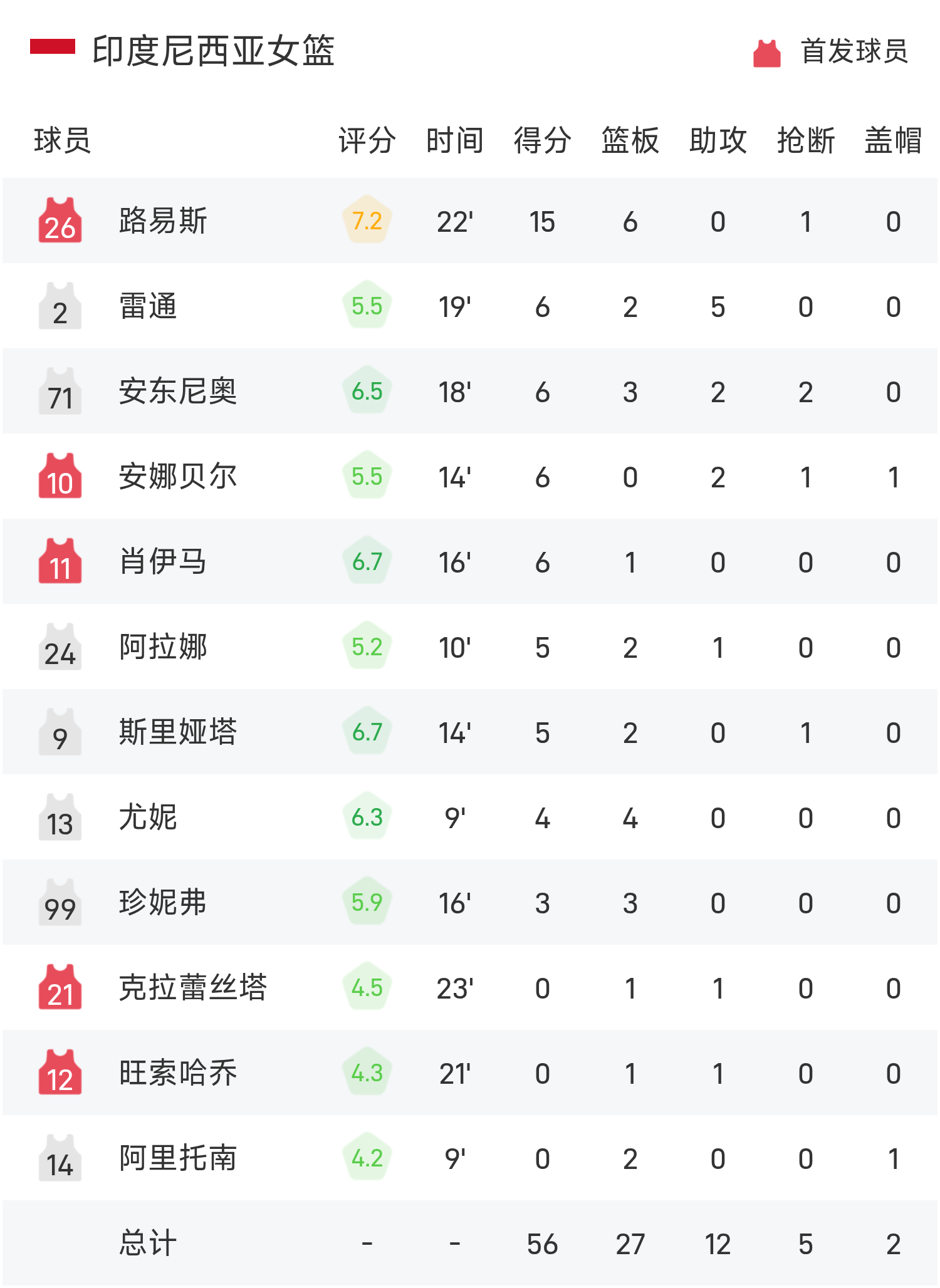 07月13日讯 女篮亚洲杯小组赛,中国女篮对阵印度尼西亚女篮。双方全场战罢,中国女篮110-59战胜印度尼西亚女篮。罗欣棫得到13分6板4助率队取胜,路易斯空砍全场最高的15分6板。